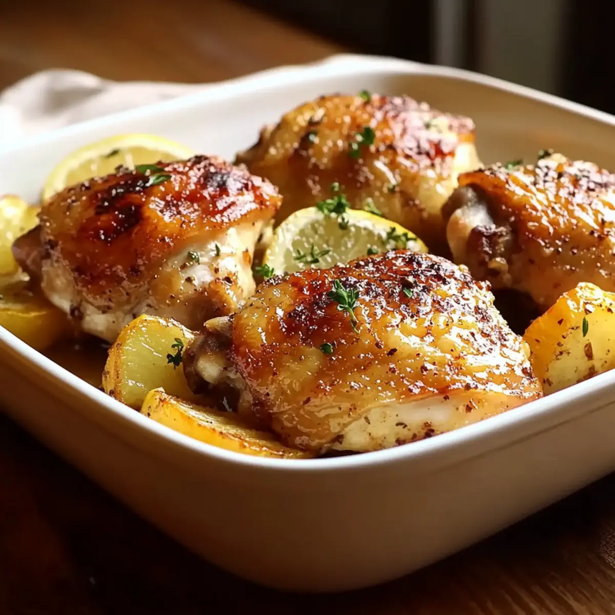 To reheat, place the baked chicken thighs on a wire rack set inside a baking sheet, then preheat your oven to 375°F (190°C). Bake for 10-15 minutes, and the rack will allow for air circulation, keeping the skin deliciously crisp while warming the meat. Enjoy your freshly heated meal!