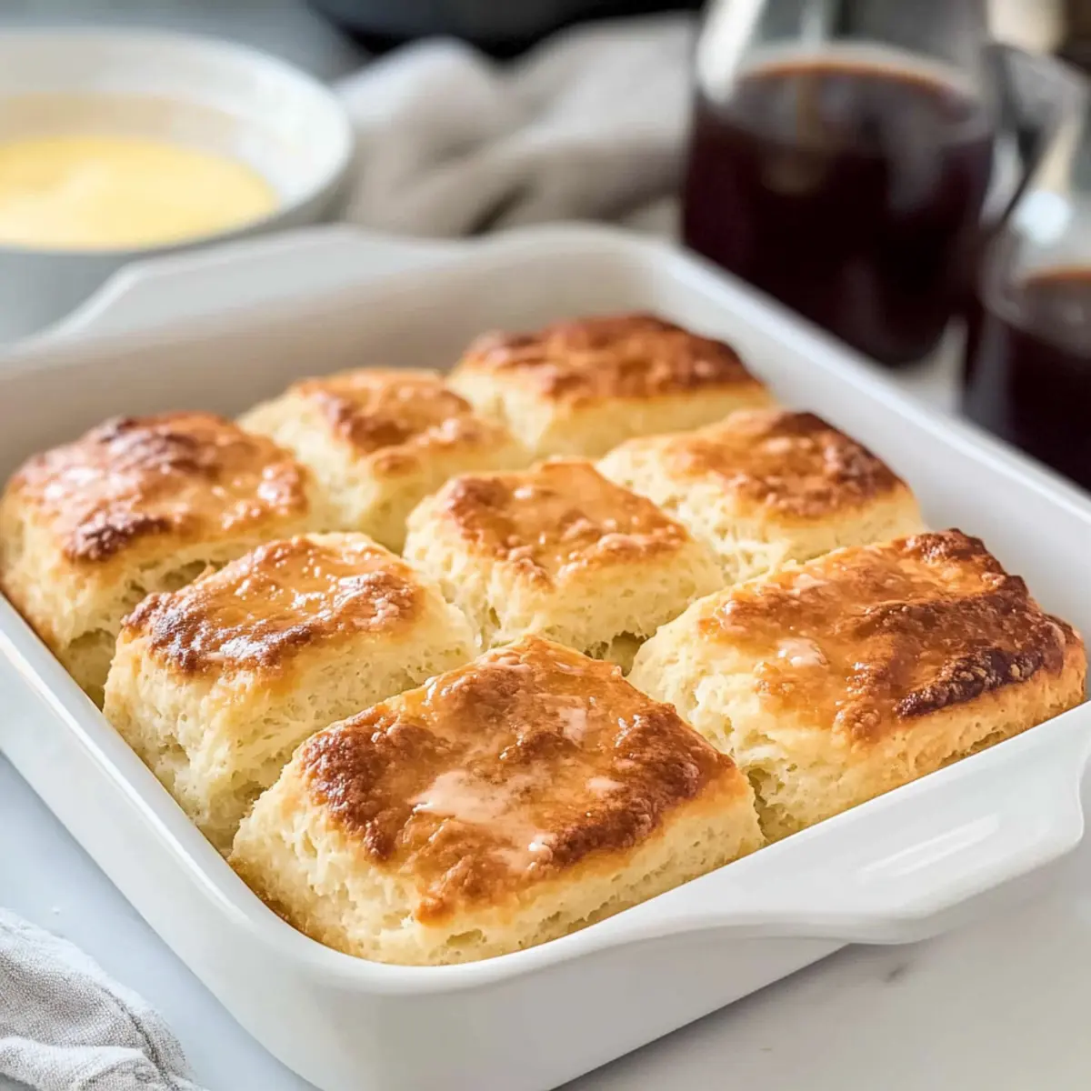 Melt ½ cup of butter and pour it into an 8×8 casserole dish, ensuring the bottom is evenly coated. The melted butter will create a rich, crispy base for your biscuits as they bake. Make sure it’s spread well; this will enhance the flavor and contribute to the desired texture of the finished dish.
