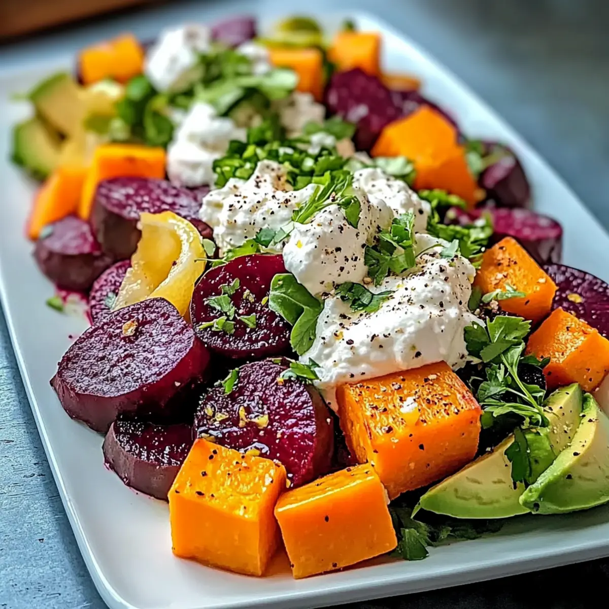 Roasted Beet, Sweet Potato & Avocado Salad with Whipped Ricotta