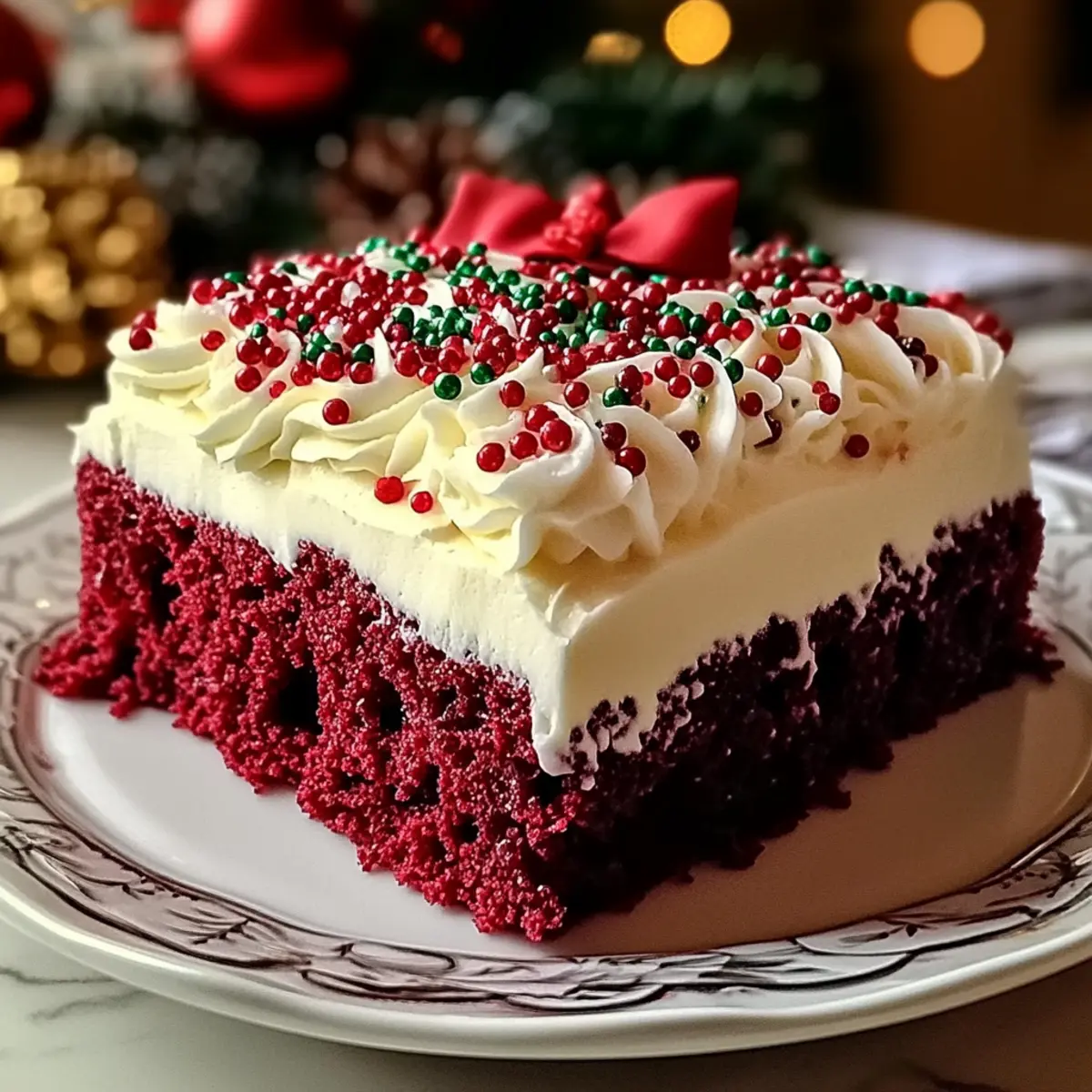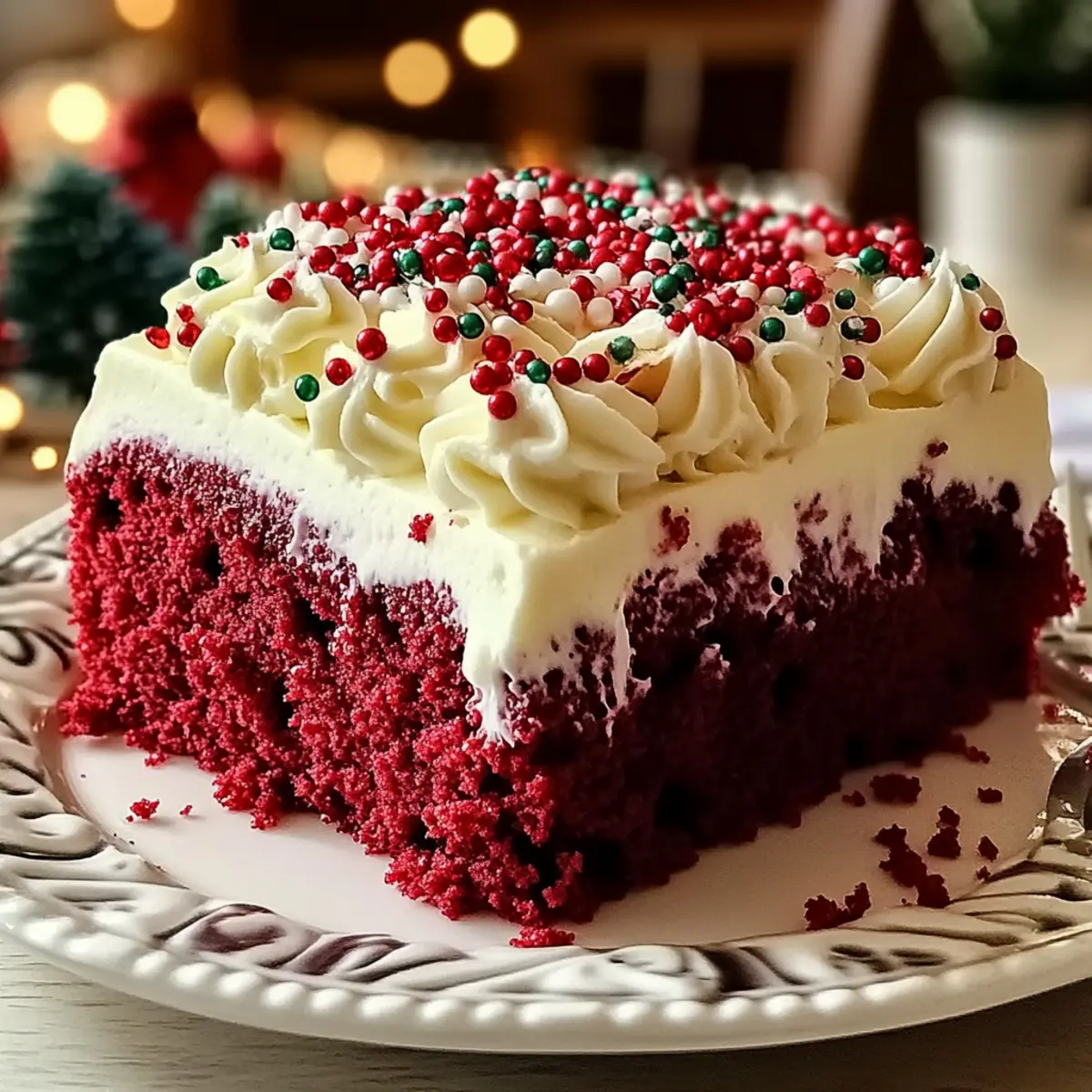 Sprinkle an array of festive red and green sprinkles over the whipped topping to add a cheerful touch. Feel free to customize with any fun edible decorations or extra festive touches that you adore; this makes your Christmas Red Velvet Poke Cake truly special.