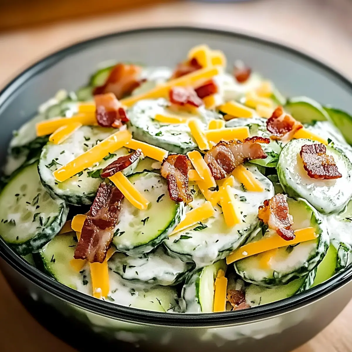 Creamy Bliss: This salad combines creamy dressing, crunchy cucumbers, and crispy bacon for a delightful flavor explosion.