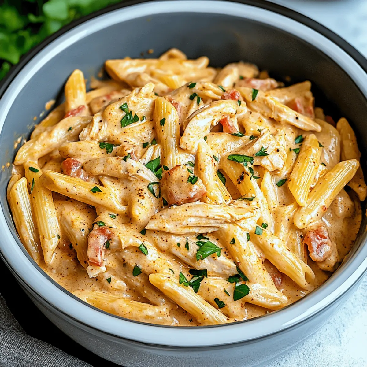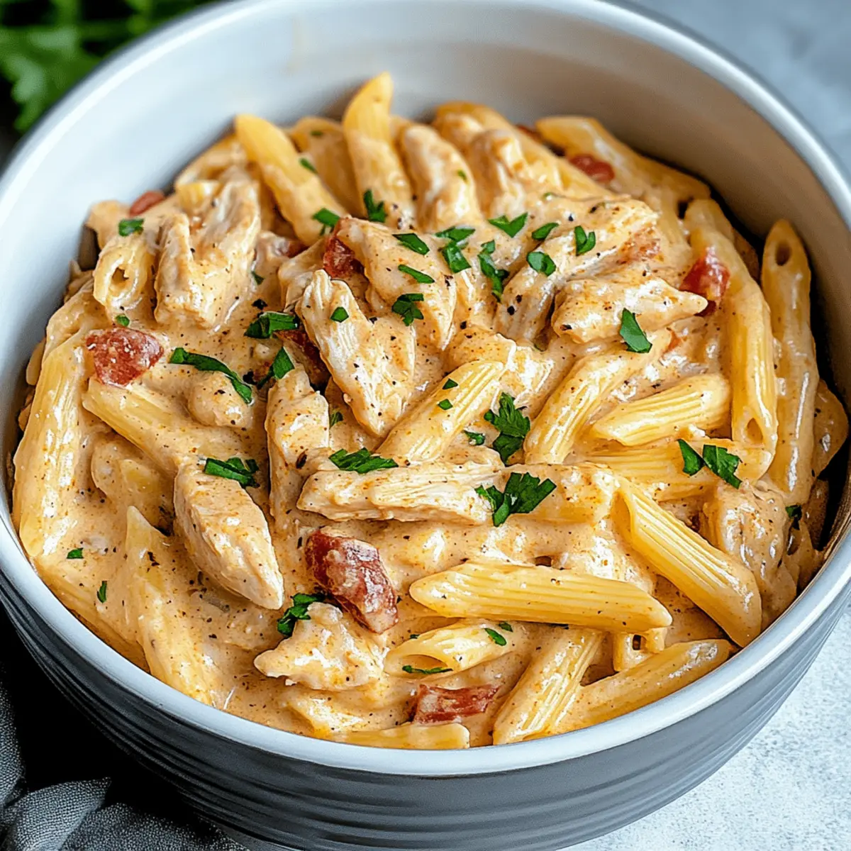- Fold the pasta into the creamy chicken mixture, adding reserved pasta water for desired consistency. Serve hot.