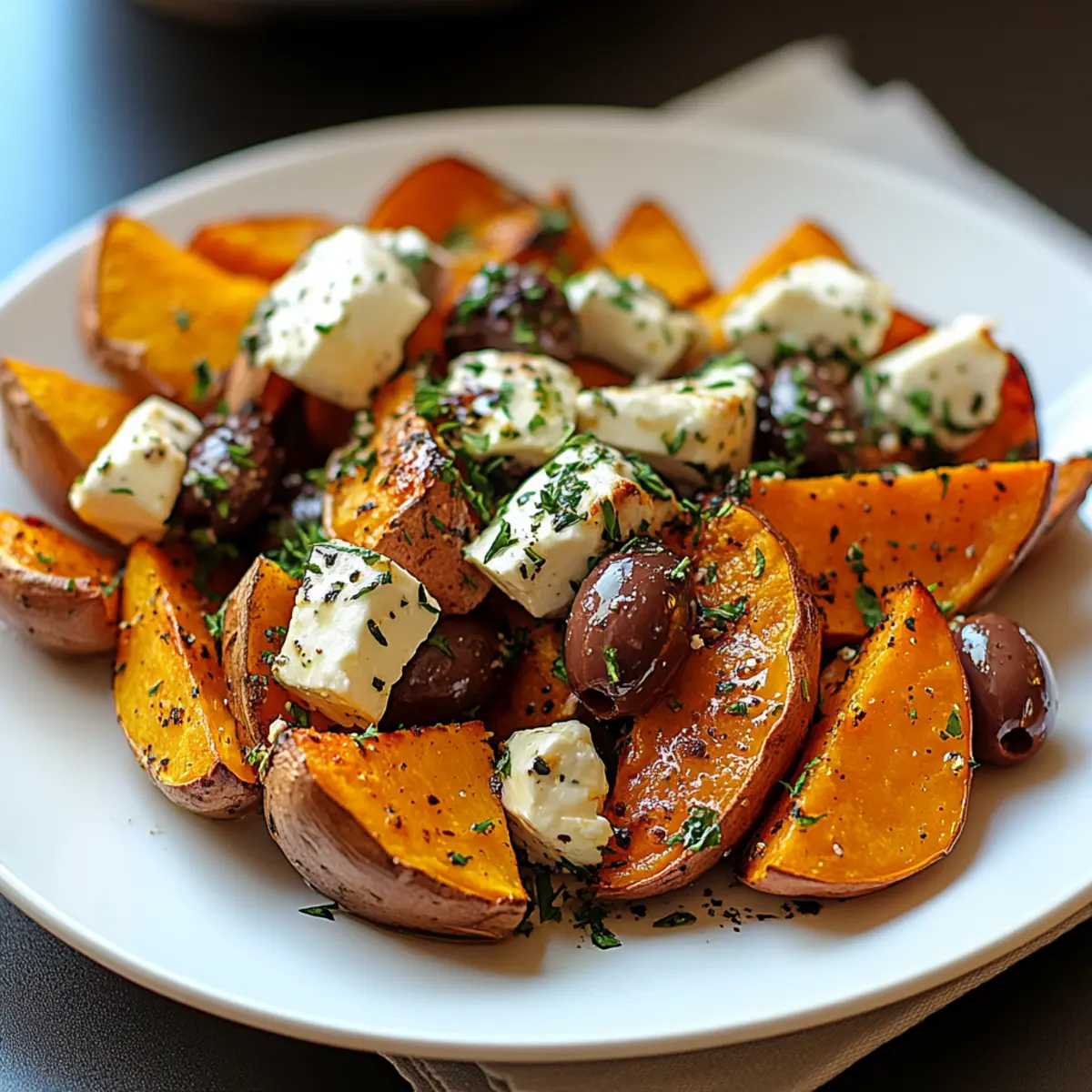 - Once roasted, remove from the oven and sprinkle feta cheese and Kalamata olives over the sweet potatoes.