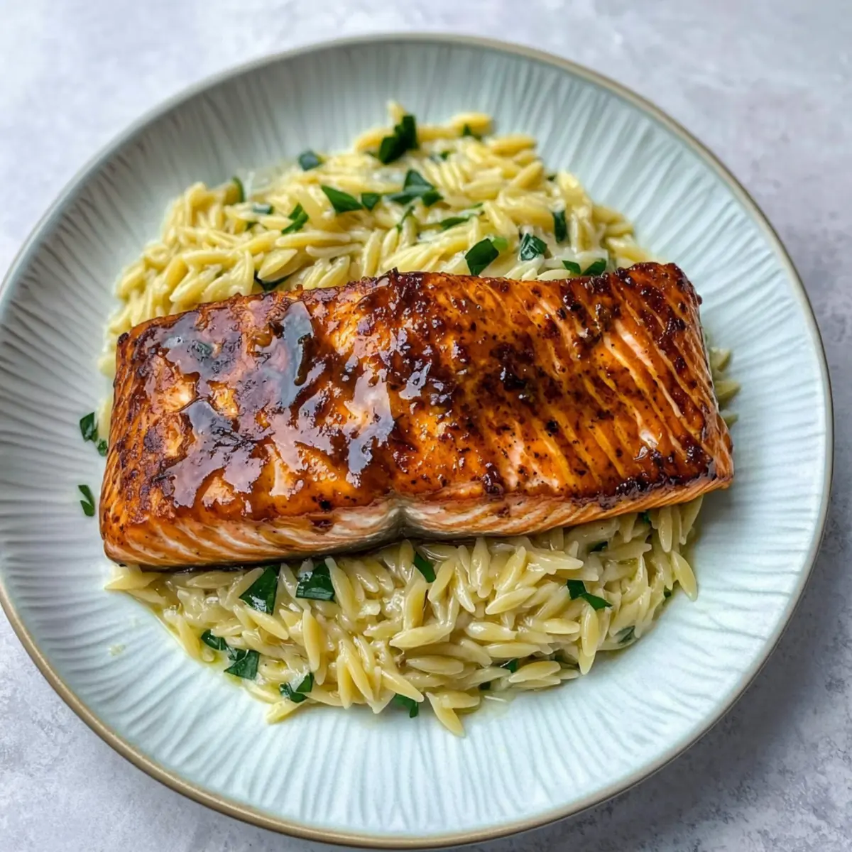 - Serve: Scoop a portion of creamy orzo onto each plate as a base, place the glazed salmon fillets on top, and drizzle with any remaining glaze. Garnish with chopped parsley or sesame seeds before serving.