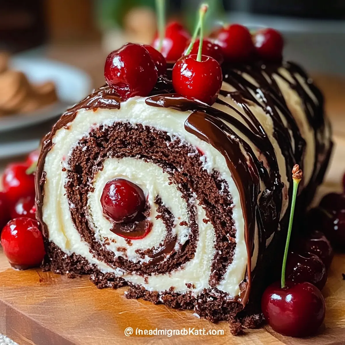 Exquisite Presentation: The Elegant Black Forest Cake Roll is a true showstopper, thanks to its rich chocolate ganache and vibrant cherry filling that create an eye-catching dessert.