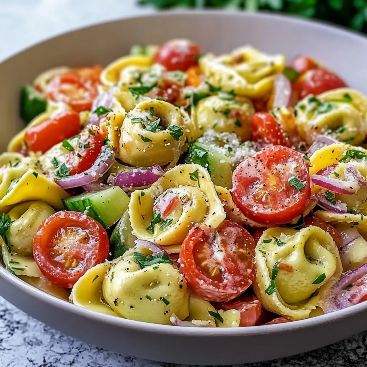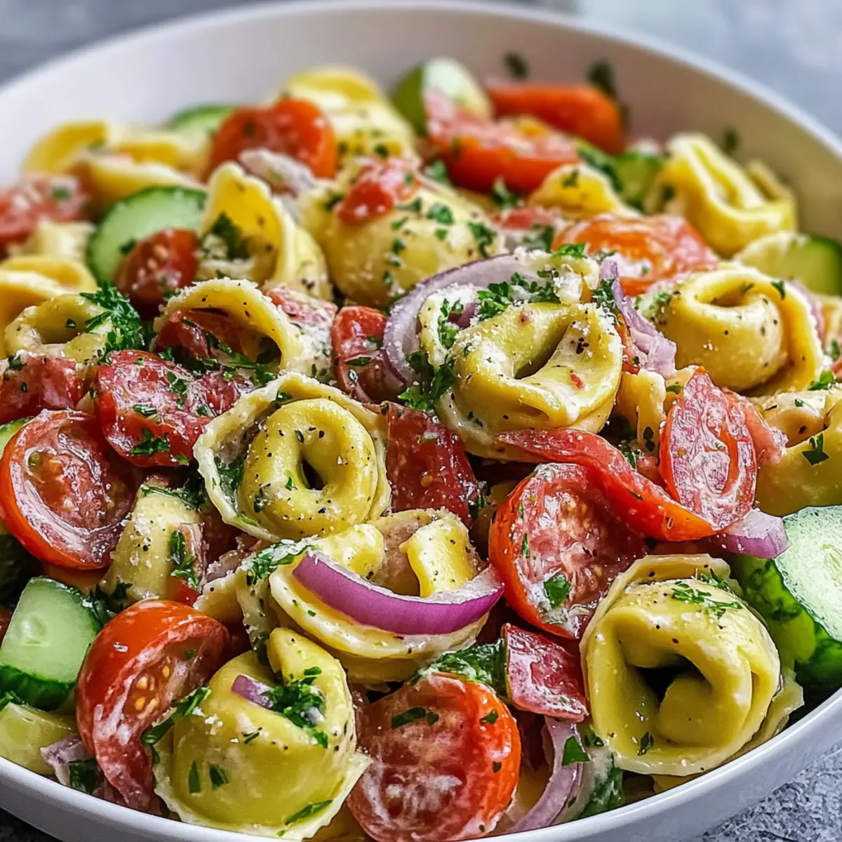 - Combine Ingredients: In a large bowl, mix cooled tortellini, chopped vegetables, and fresh herbs.