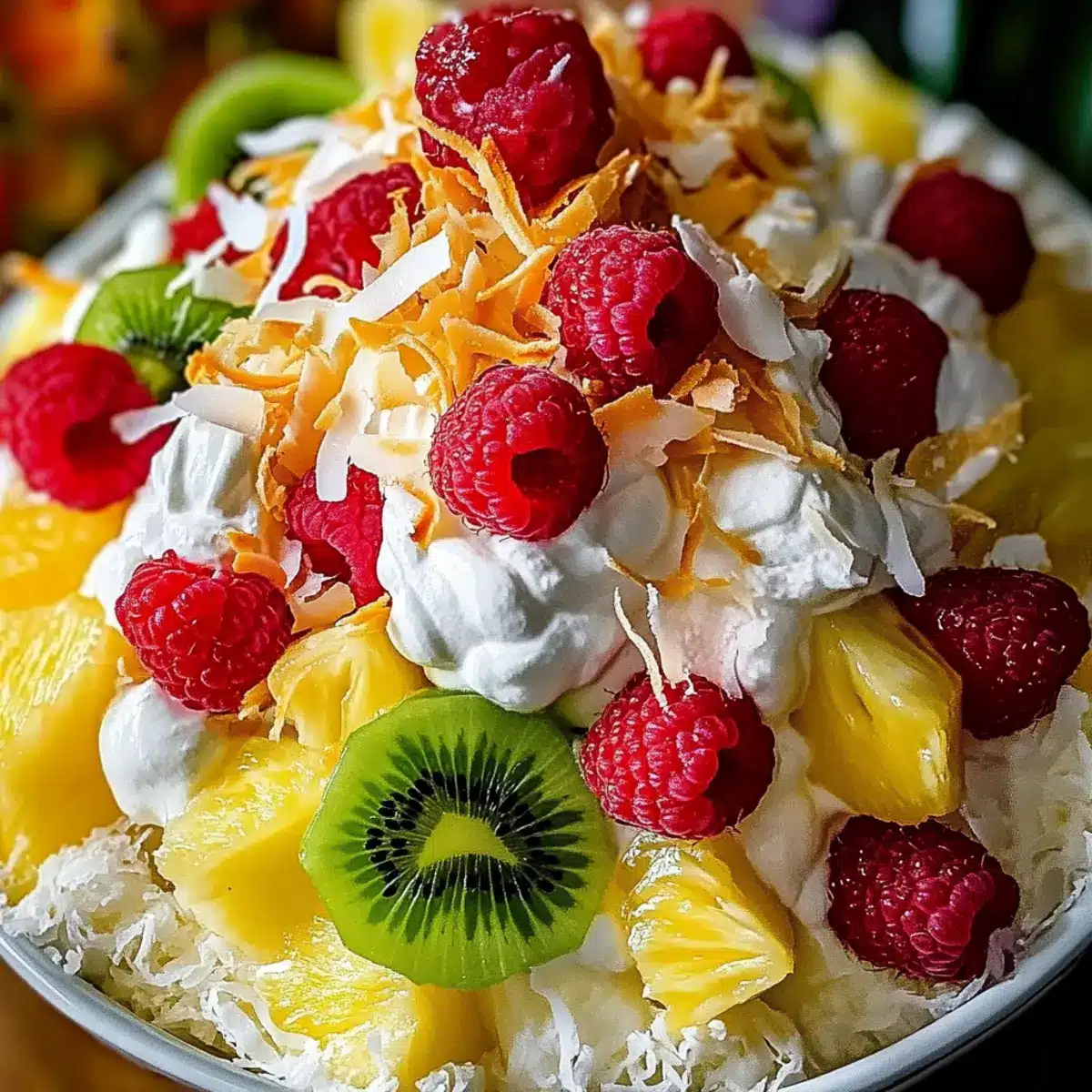 Gently fold the prepared fruits—including fresh strawberries, pineapple, kiwi, and a handful of raspberries—into the cheesecake mixture. Stir carefully until all the fruits are evenly coated, ensuring that you preserve the integrity of the delicate fruits while creating a visually appealing blend for your Hawaiian Cheesecake Salad.