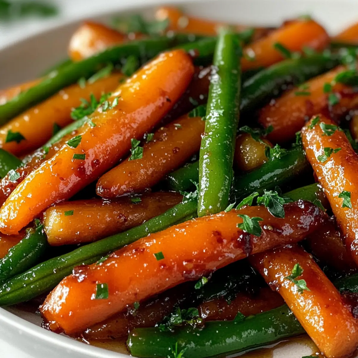 Once roasted to perfection, remove the baking sheet from the oven. Transfer the Honey Glazed Carrots & Green Beans to a serving dish, allowing the sticky glaze to shine. Finish by garnishing with freshly chopped parsley for a pop of color and freshness. Serve immediately and enjoy this delightful side dish!