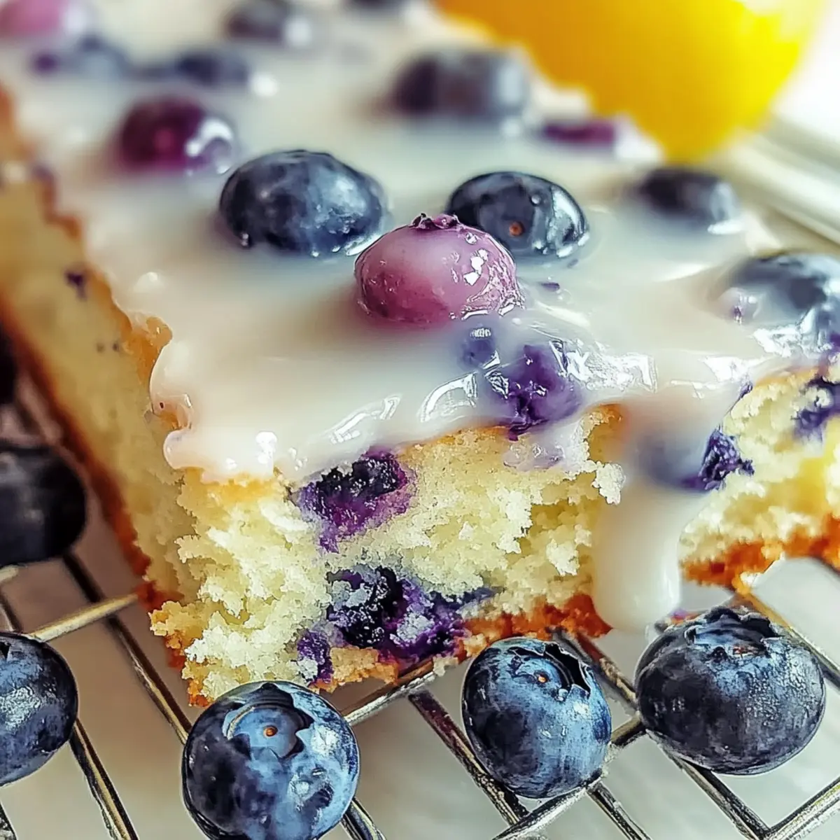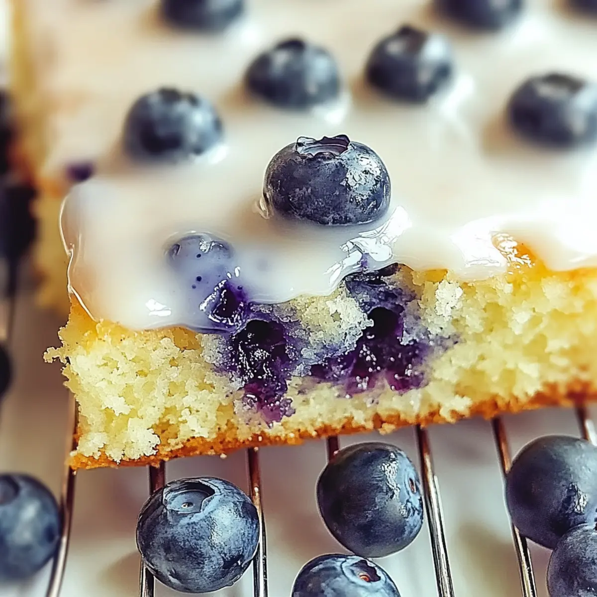 Once baked, remove the Lemon Blueberry Sheet Cake from the oven and allow it to cool in the pan for about 15 minutes. Afterward, carefully transfer it to a wire rack to cool completely. While it’s cooling, whisk together the powdered sugar and additional lemon juice to create a smooth glaze. Drizzle it over the cooled cake and let it set before slicing.