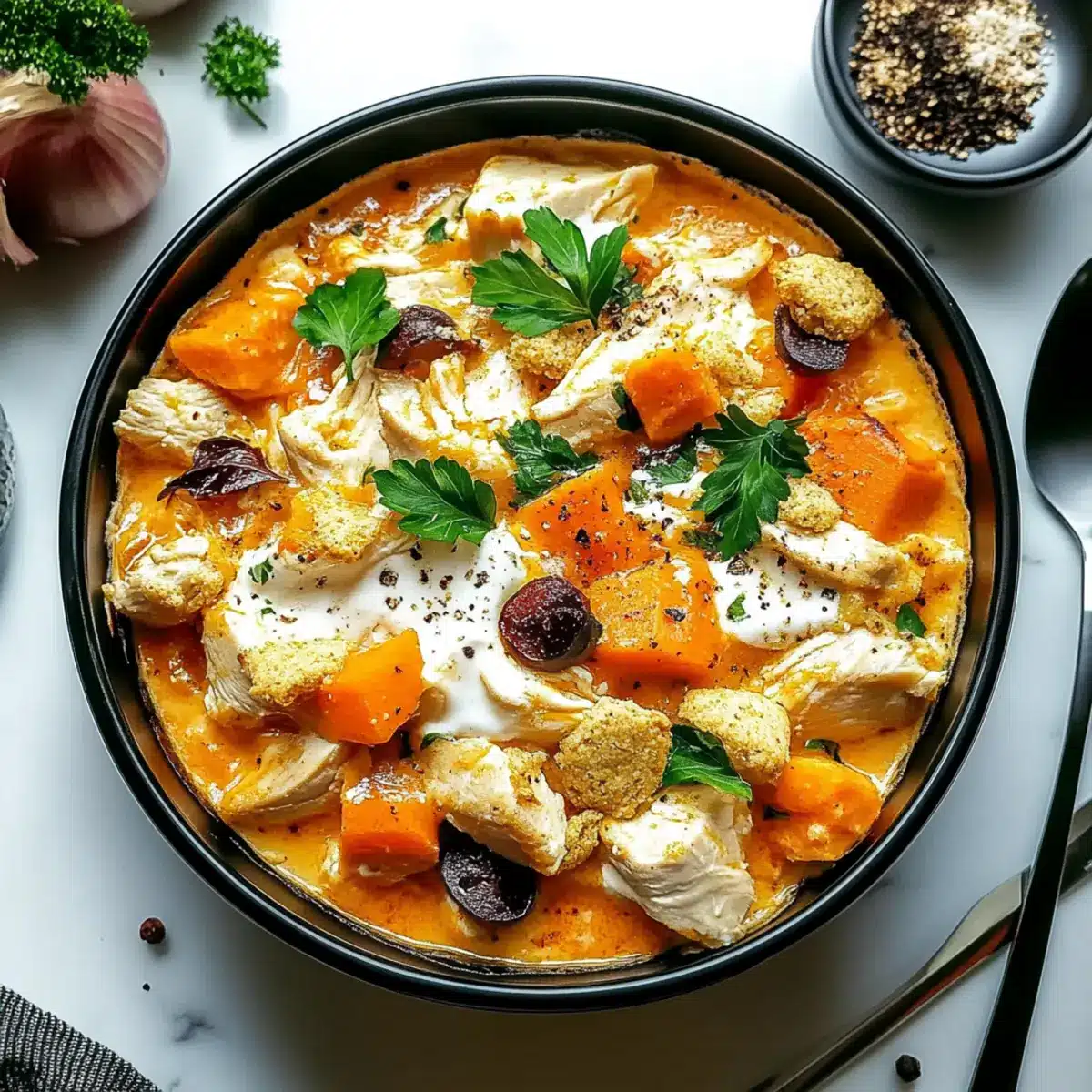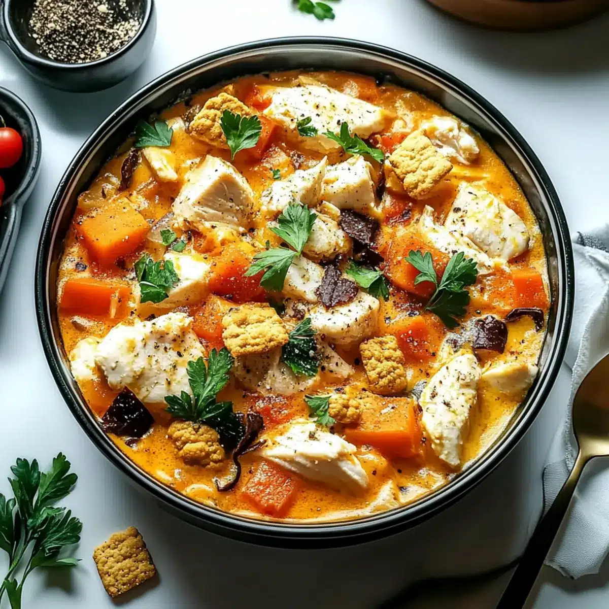 • Cooked Chicken – Provides a hearty protein base and rich texture; feel free to use pre-cooked or rotisserie chicken for convenience.