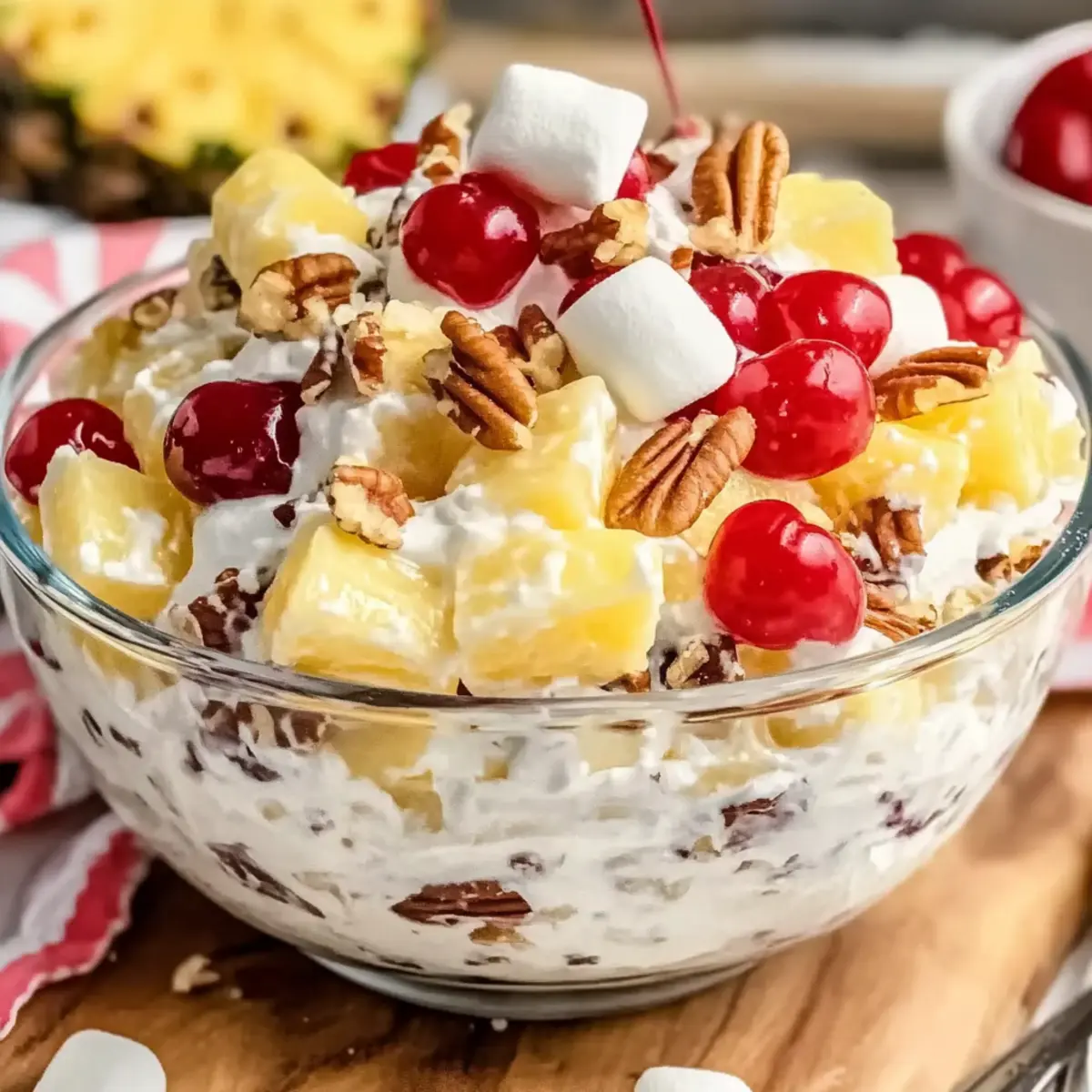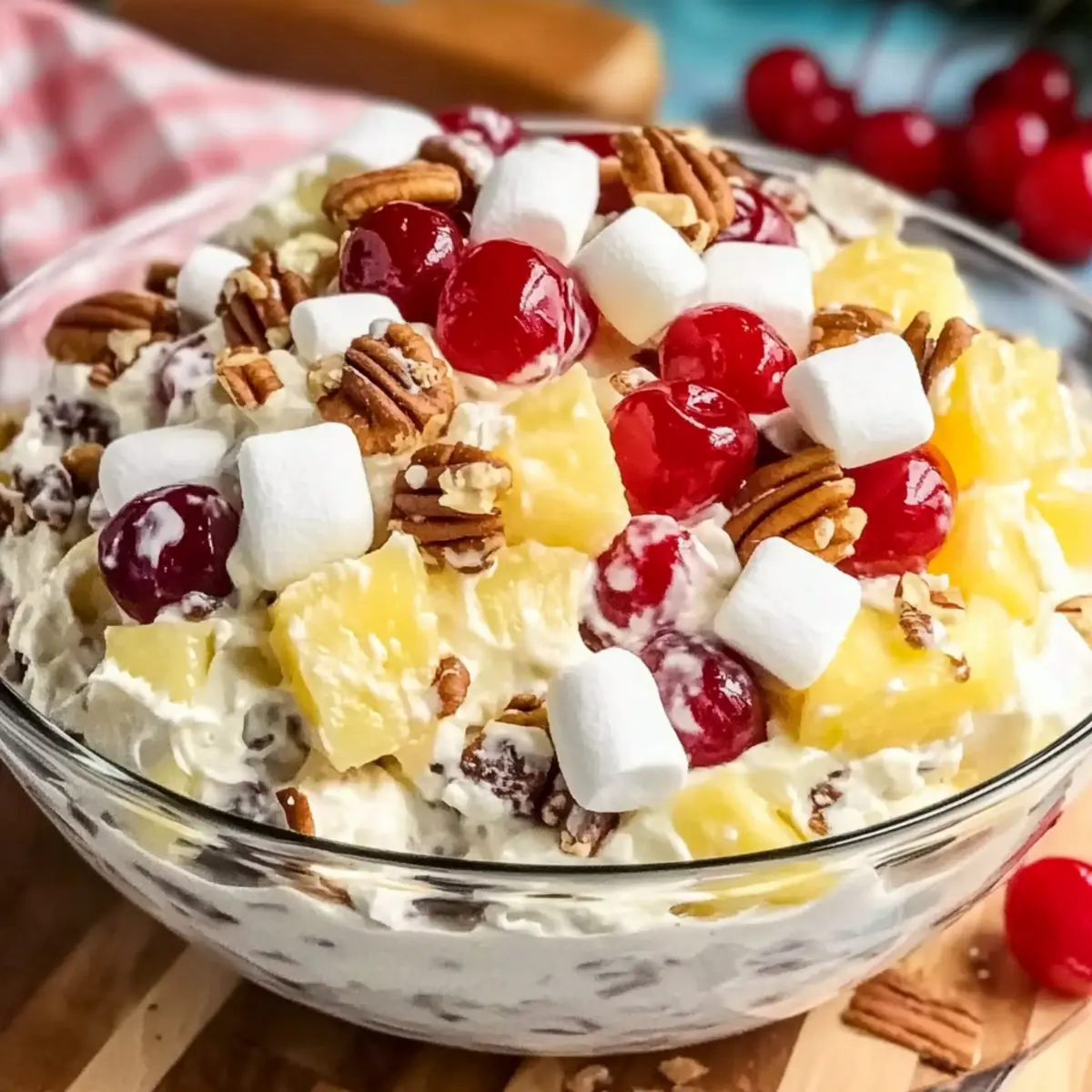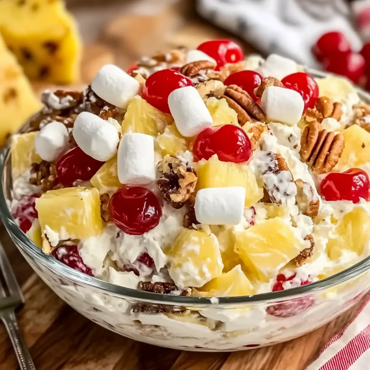 - In a large bowl, combine 2 cups of pineapple chunks, 1 cup of halved maraschino cherries, 1 cup of mini marshmallows, 1 cup of sweetened flaked coconut, and 1 cup of chopped pecans. Stir gently until evenly mixed.