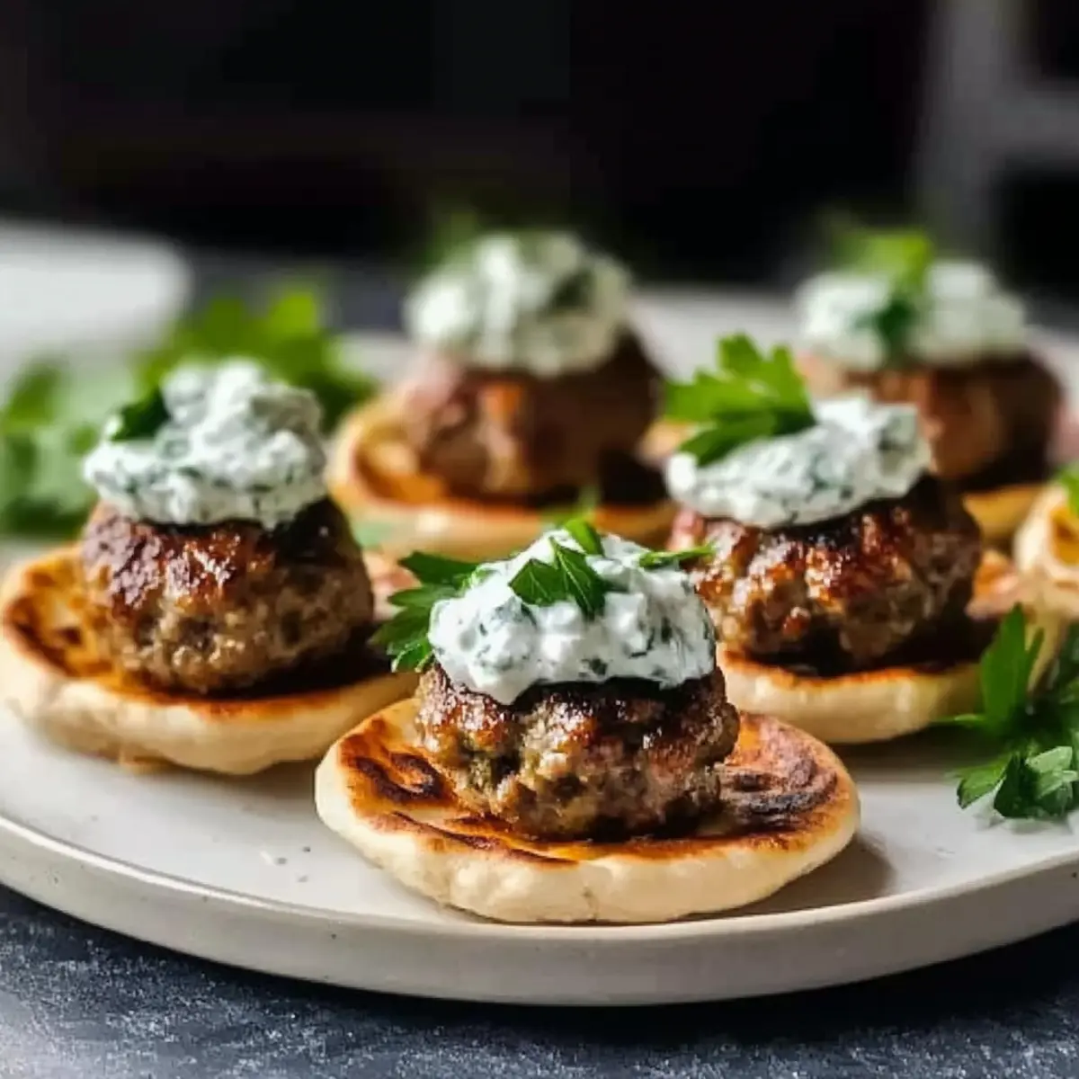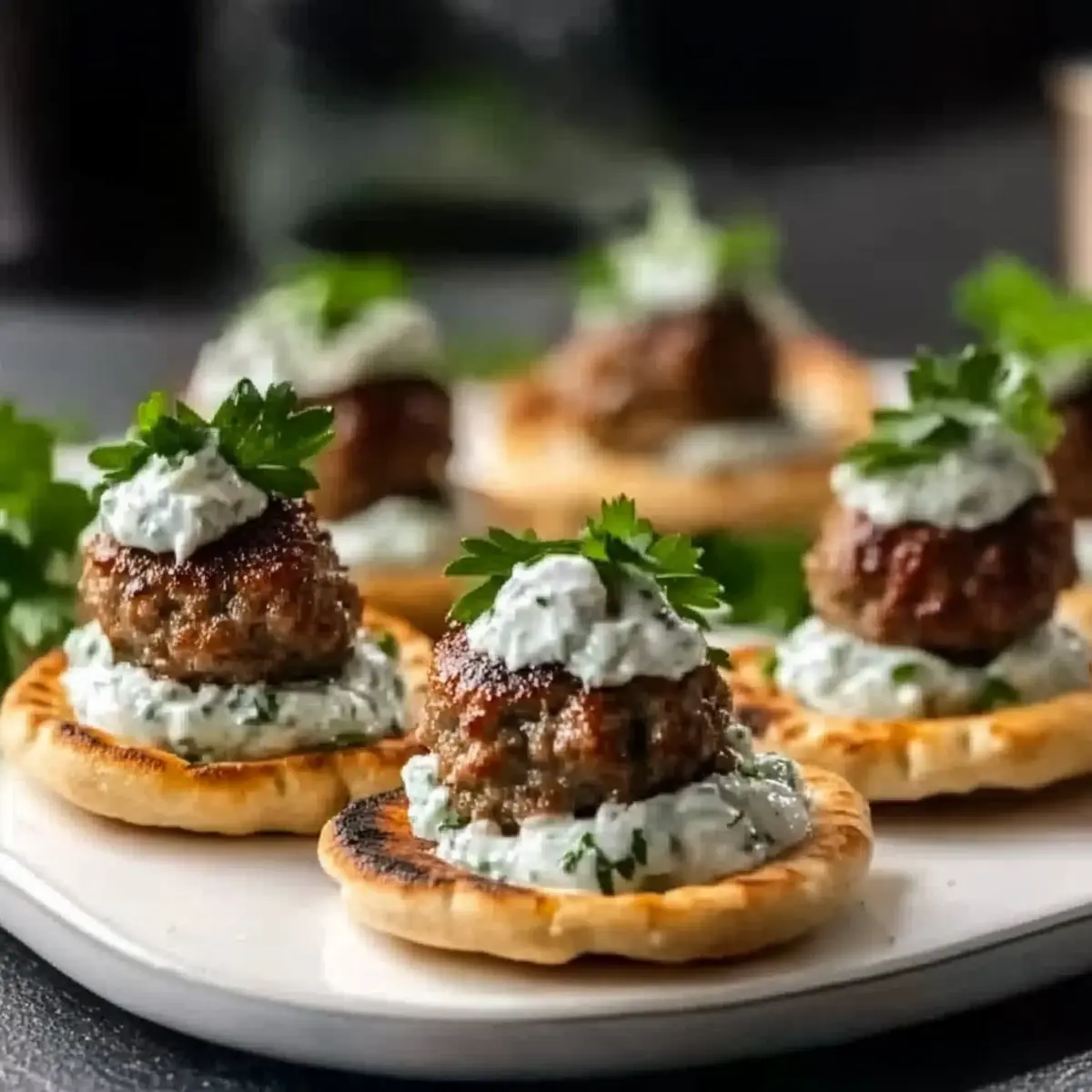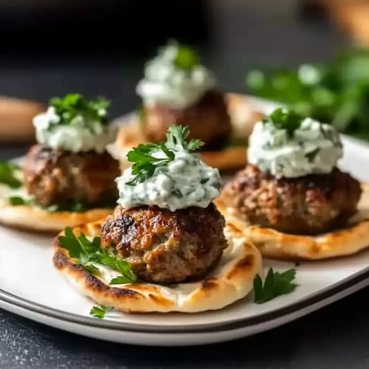 - Take a warm mini pita round, place a meatball on top, drizzle with tzatziki, and add a sprinkle of fresh herbs if desired.