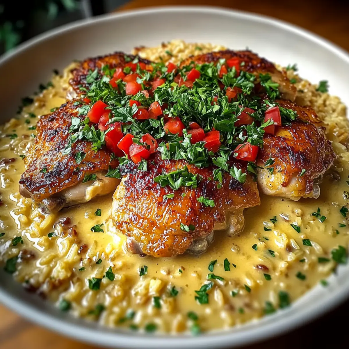 Once thickened, remove the skillet from heat and garnish with freshly chopped parsley for a pop of color. Serve your delightful Pollo Cremoso con Arroz hot from the skillet, letting each bite wrap you in comforting, creamy goodness.