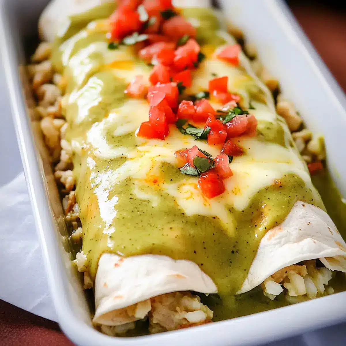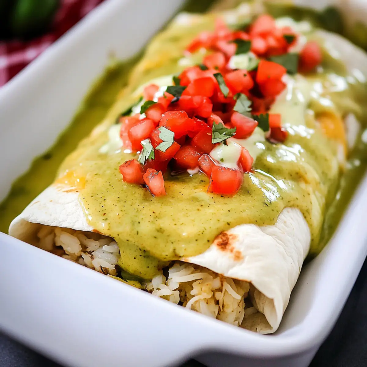 Grease a 9×13 inch baking dish with cooking spray or oil. Place the assembled burritos seam-side down in the dish. Drizzle the creamy salsa-Verde ranch dressing generously over the top of the burritos, ensuring they are well coated. Sprinkle shredded pepper-jack cheese evenly on top, then bake in the preheated oven at 375°F (190°C) for 15-20 minutes, or until heated through and the cheese is melted and bubbly.
