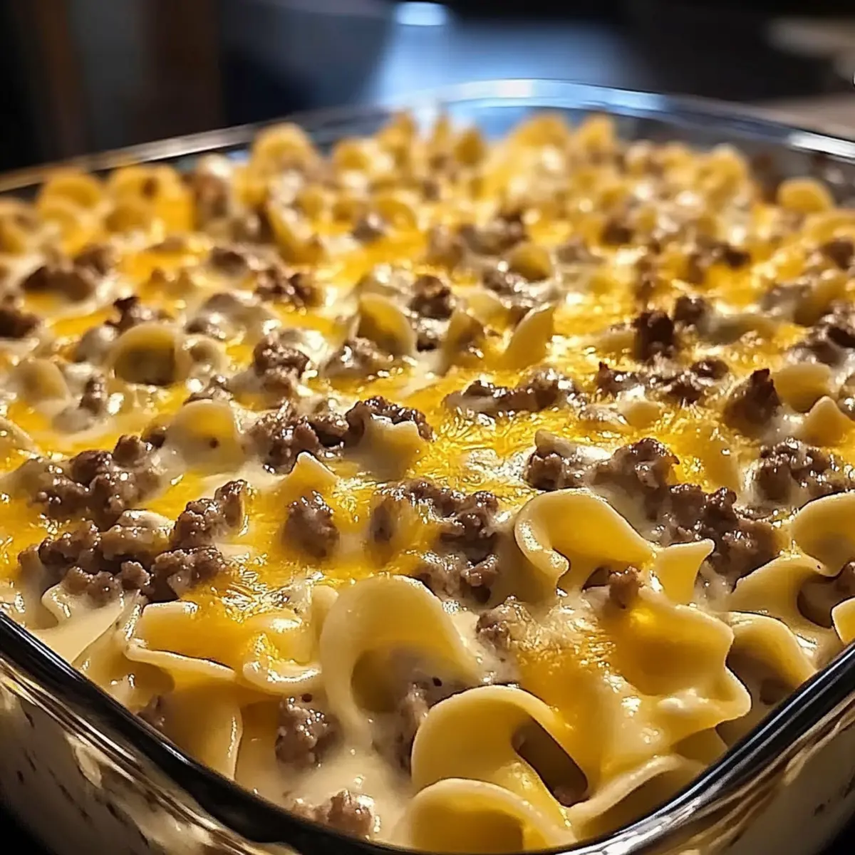 Grease a baking dish and transfer the noodle and beef mixture into it, spreading it out evenly. Sprinkle a generous layer of shredded cheddar cheese on top to create a rich, gooey topping. Place the dish in your preheated oven, allowing it to bake for 25 to 30 minutes until the cheese is melted, bubbly, and turning a light golden brown.