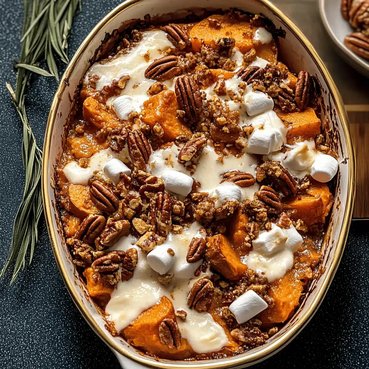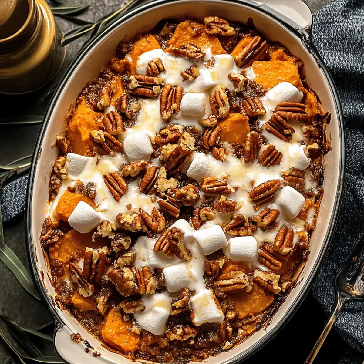 Lightly grease a 9×13 baking dish with butter or cooking spray. Pour the sweet potato filling into the dish, spreading it evenly. Dot the surface with small cubes of unsalted butter and add the remaining marshmallows, tucking them into the mixture for a sweet top layer that will melt beautifully during baking.