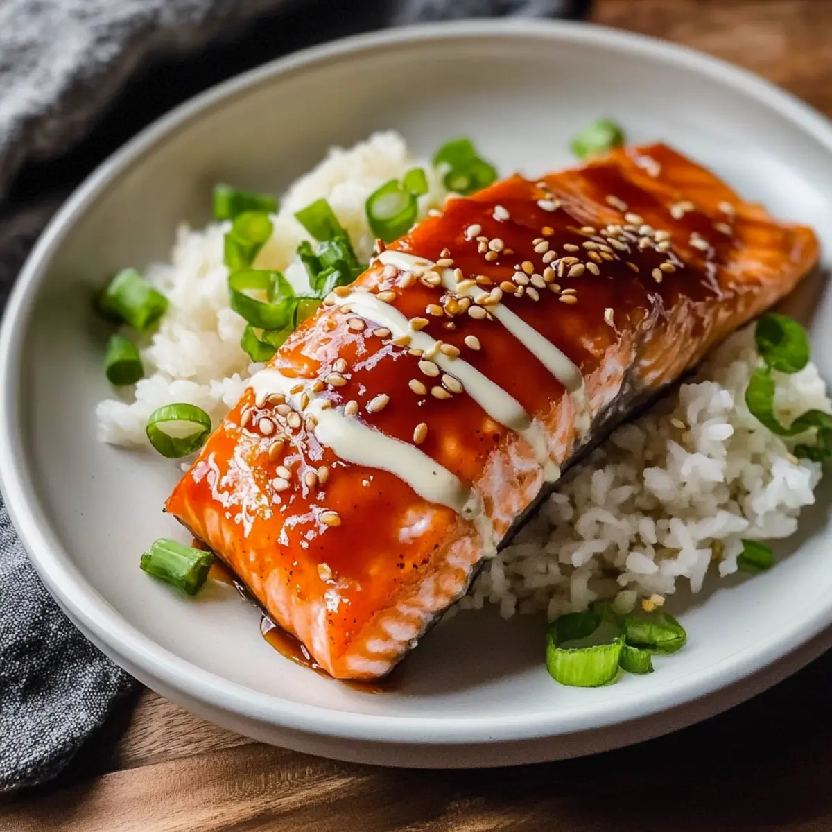 - Brush cooled glaze over salmon and let rest for 3-5 minutes. Drizzle with Kewpie mayo and garnish with sesame seeds, green onions, and crushed red pepper flakes.