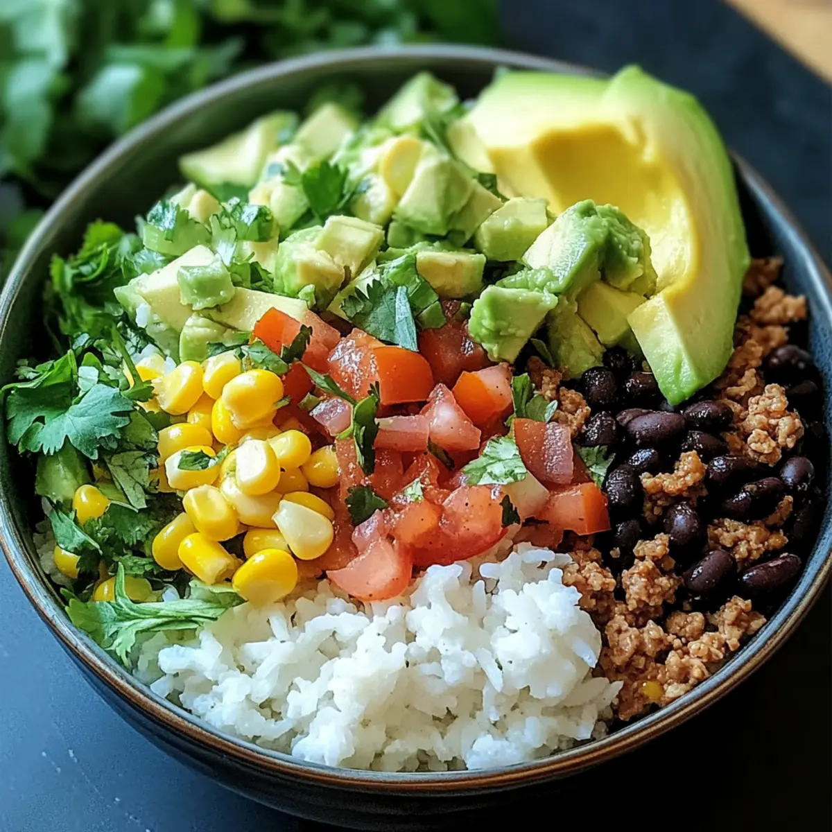 - To assemble, layer cilantro lime rice at the bottom of each bowl, top with turkey mixture, then romaine lettuce, corn, black beans, and toppings.