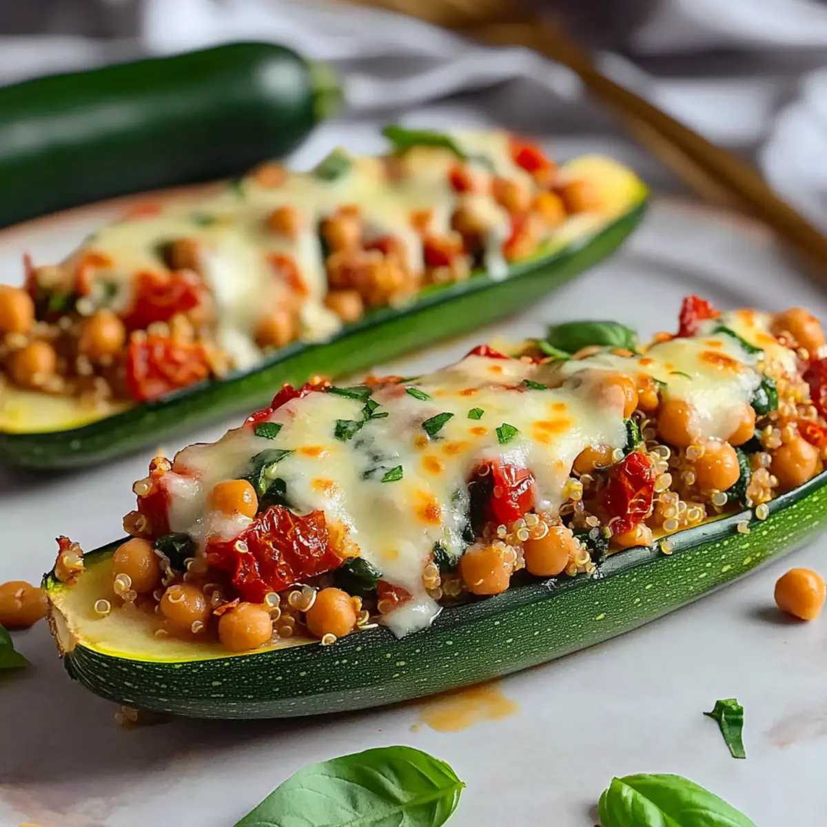 These Tuscan Stuffed Zucchini Boats with Quinoa are ideal for meal prep, saving you valuable time on busy weeknights! You can prepare the filling (quinoa, chickpeas, and vegetables) up to 3 days in advance and store it in an airtight container in the refrigerator. Hollow out the zucchini and pre-season them up to 24 hours ahead; just remember to drizzle them with olive oil before storing to prevent browning. When you’re ready to cook, simply fill the zucchini boats with the prepped filling, top with mozzarella, and bake as instructed. This way, you’ll enjoy all the comforting flavors with minimal effort, resulting in delicious, homemade meals that fit seamlessly into your life!